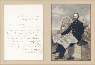 Autographed letter signed ("U.S. Grant"), one page, Santa Fe, New Mexico, July 16, 1880. To "Mr. Hines" thanking him for "a very pleasant visit" and indicating that he hopes to have the "opportunity of reciprocating your hospitality." Framed and matted with reproduction color portrait.