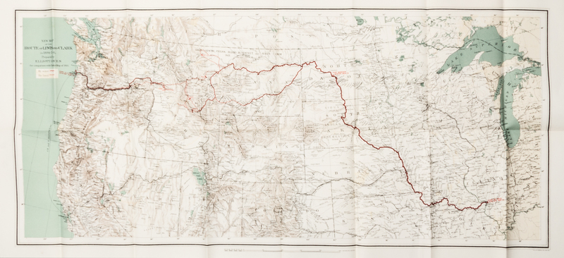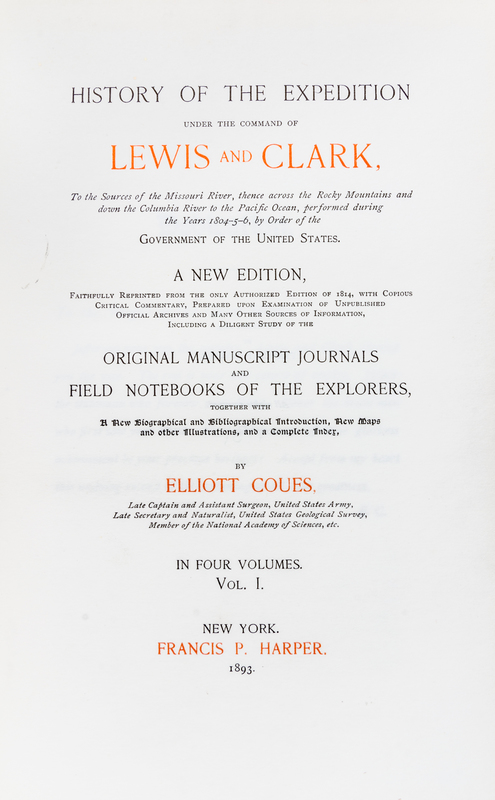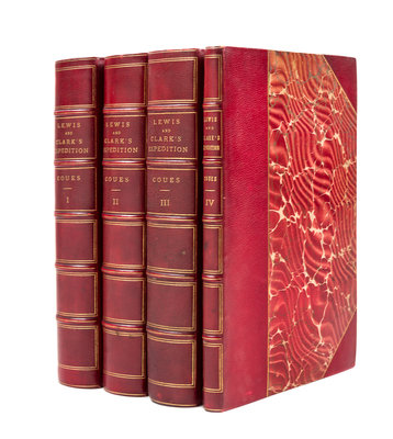 History Of The Expedition Under The Command Of Lewis And Clark, To The Sources Of The Missouri River... New York: Francis P. Harper, 1893. 4 vols. 8vo, 3/4 red morocco over marbled boards, t.e.g. First edition, number 155 of 1000. With two frontispieces, two facsimile letters and an atlas/index vol. containing five full-page maps, two fold-out letterpress tables, and three large folding maps in a pocket sleeve inside the rear cover. Bookplate tipped in front pastedowns: Frank O. Lowden; minor shelfwear and a slight warp to boards.