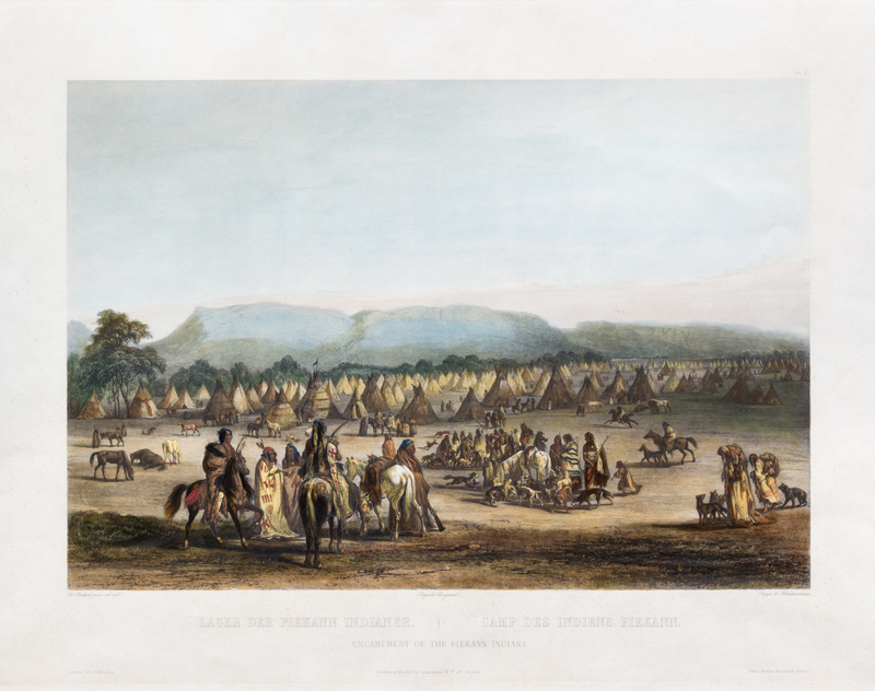 Pikaan Indian Encampment. Engraving with handcoloring. London: Ackerman, n.d., with the printer's blindstamp.
