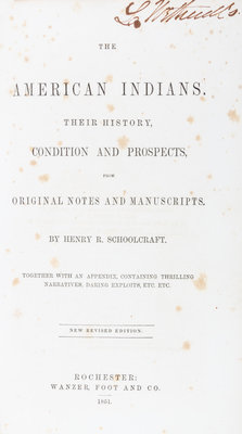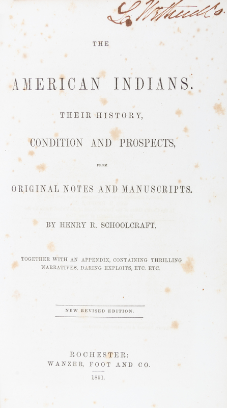 The American Indians, Their History, Condition and Prospects from Original Notes and Manuscripts. Rochester: Wanzer, Foot and Company, 1851.4to, publisher's blind stamped blue cloth-backed boards, mylar jacket, gilt-lettered spine. Spine sunned; pages cockled; light intermittent foxing.