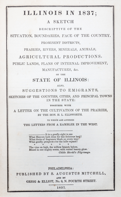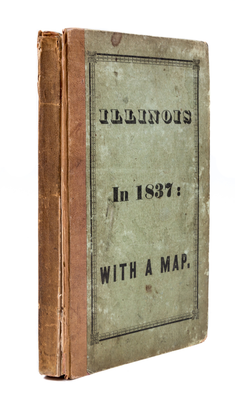 Illinois in 1837: With a Map. Philadelphia: S. Augustus Mitchell, 1837.8vo, original cloth backed printed boards. Complete with a fold-out map with outline color. First edition, with "Animals" spelled correctly on the title page. Howes M689. Wear to boards and endpapers.