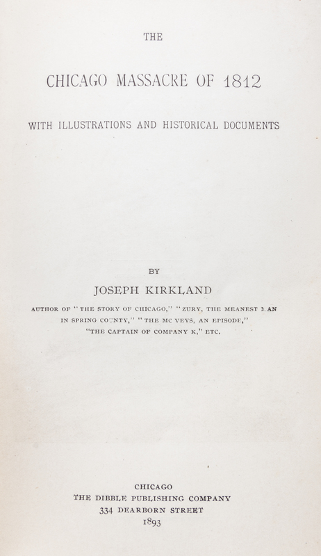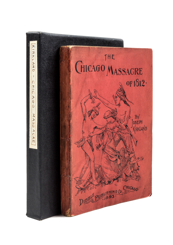 The Chicago Massacre of 1812.8vo, original printed paper wrappers. First edition. Illustrated. Binding is moderately rubbed and soiled, with minor repair to front hinge. Protected in a custom slipcase; bookplate of Joseph T. Ryerson to f.f.e.p.