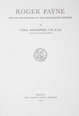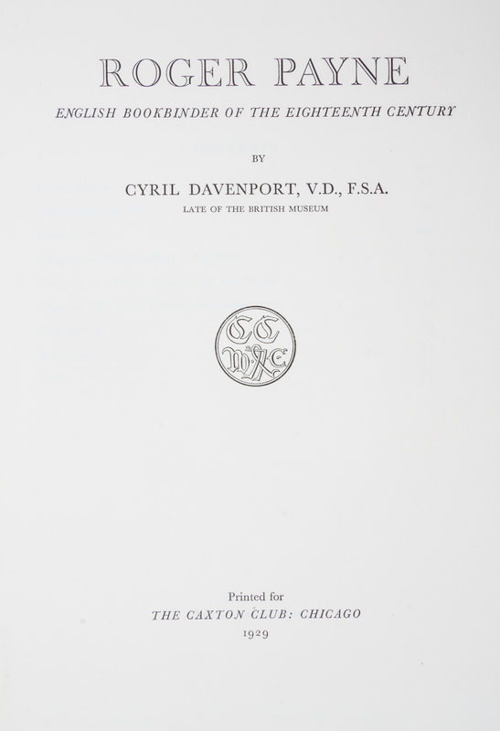 A group of three works by Cyril Davenport, all with plates and illustrations. Chicago: Caxton Club, various dates. Roger Payne: English Bookbinder of the Eighteenth Century. Chicago, 1929. One of 250; Samuel Mearne: Binder to King Charles II. Chicago, 1906. One of 250 copies; Thomas Berthelet: Royal Printer and Bookbinder to Henry VIII. Chicago, 1901. One of 252 copies.