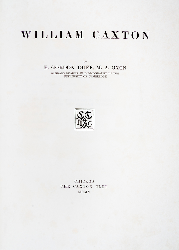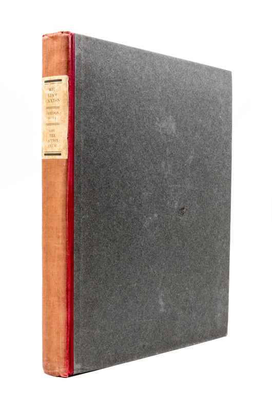William Caxton. Chicago: Caxton Club, 1905.Folio, original publisher's cloth and paper-covered boards. First edition, limited to 252 copies. Contains 25 plates with facsimiles of Caxton's types and wood-cuts. This copy one of 148 copies containing a leaf from an imperfect copy of the first edition of Chaucer's Canterbury Tales, printed by Caxton in 1478. Bookplates of John Davies Cuyps.