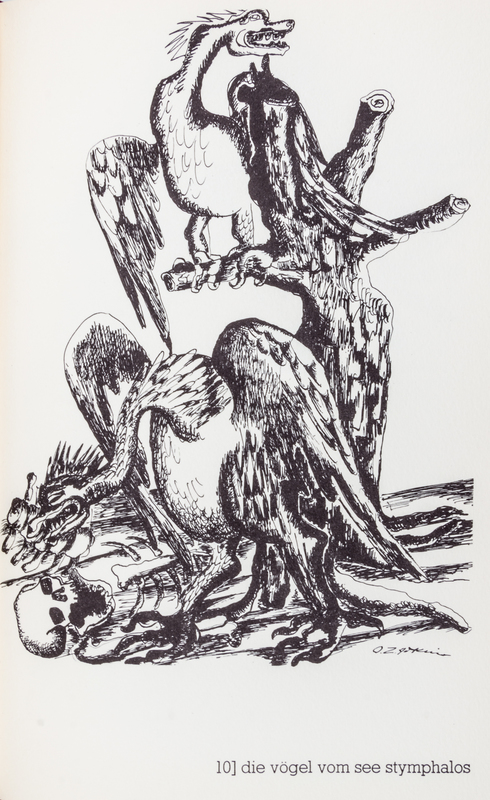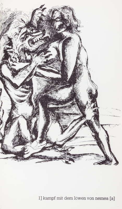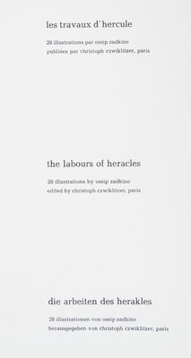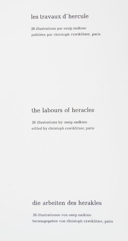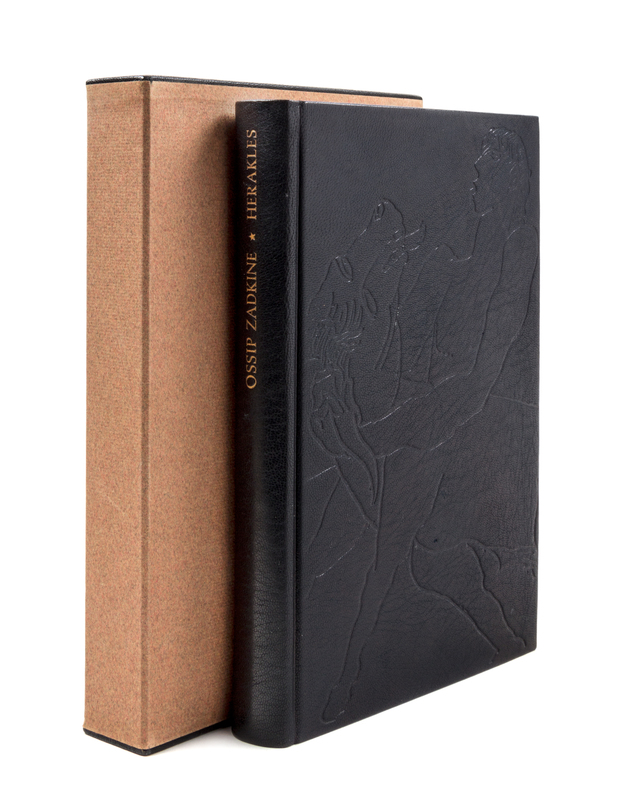 Le travaux d'hercule. The Labours of Heracles. Die arbeiten des Herakles. Paris: Christophe Czwiklitzer, n.d. [ca. 1960]8vo, original full black morocco, stamp in blind after Zadkine's design, matching slipcase. Complete with three, original color lithographs on Zerkall paper, each signed at the front, 28 lithographs signed in the plate and an additional large illustration folded into a flap at the back. Limited edition tri-lingual edition, number 100 of 150 copies signed three times on limitation page.