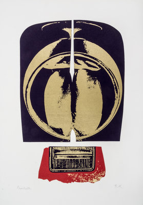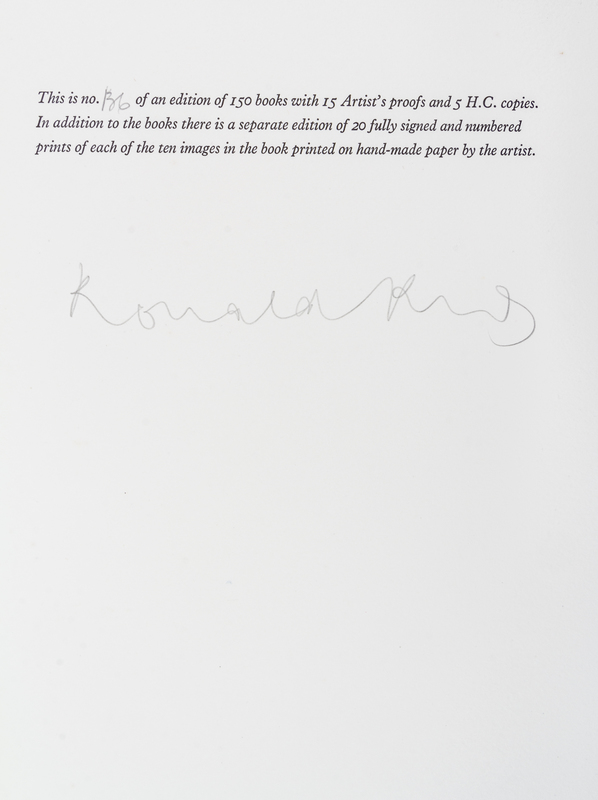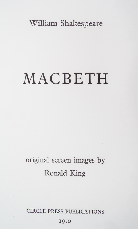Macbeth. Guildford: Circle Press, 1970. Large folio, contents loose as issued in folder, linen-backed chemise and black slipcase. Complete with 10 color silkcreens by Ronald King, each titled and initialed. Limited edition, number 136 of 150 copies signed by King.