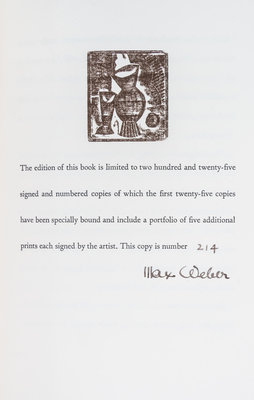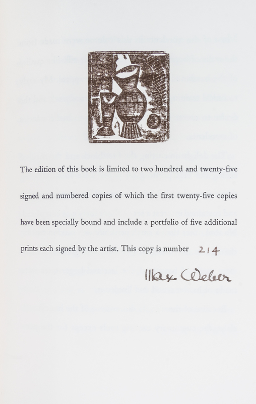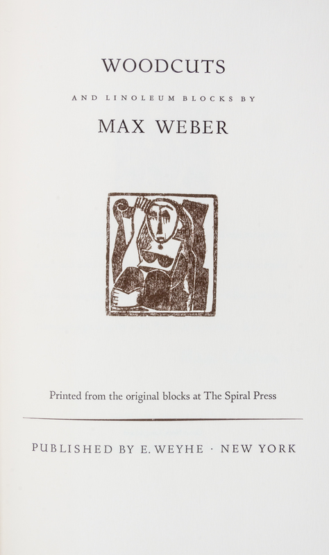 Woodcuts and Linoleum Blocks. New York: E. Weyhe, 1956.Large 8vo, linen-backed boards, slipcase, glassine. Complete with 33 woodcuts. Limited edition, number 214 of 225 copies signed by Weber.