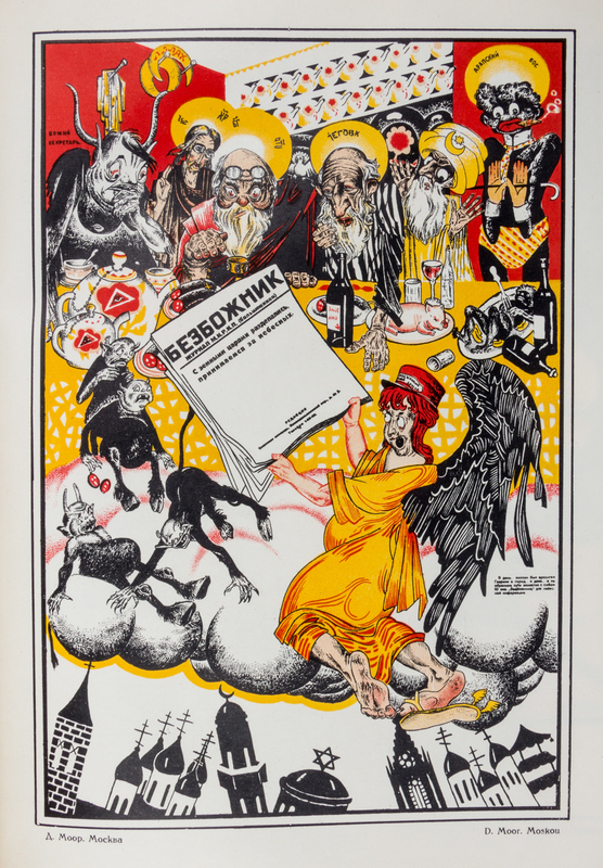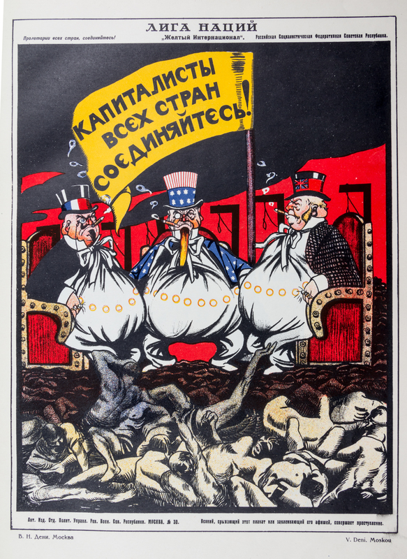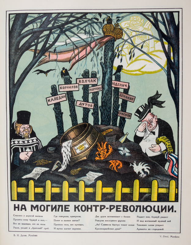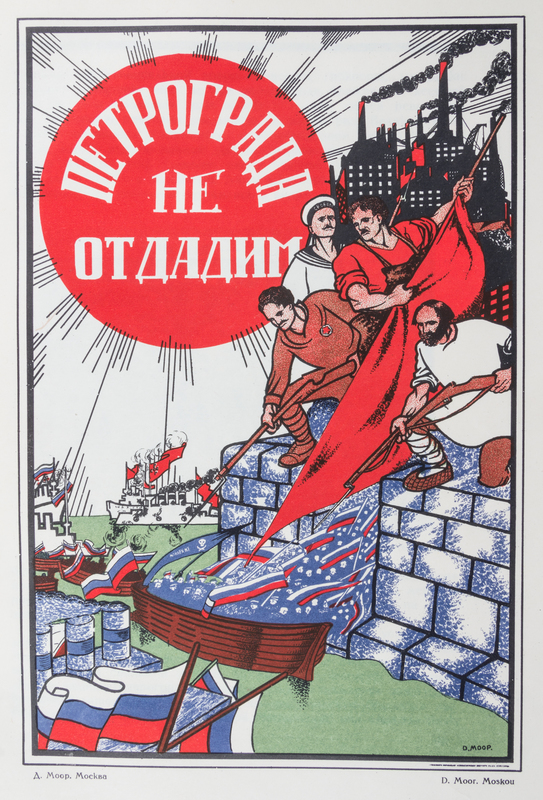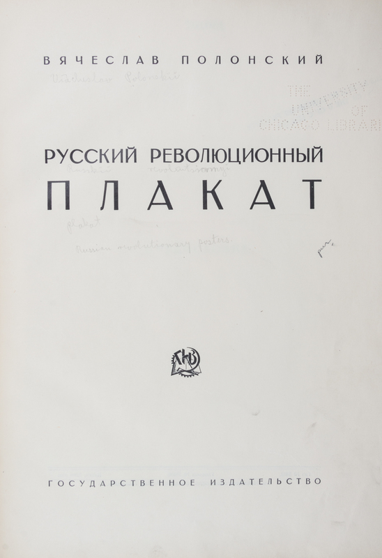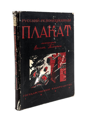 Russkii revolutsionnyi plakat [The Russian Revolutionary Poster]. Moscow: GIZ, 1925.Folio, original pictorial boards. One of 3,000 copies of this history of Russian agit-propr posters of the Revolution and immediately after. Profusely illustrated with color and black and white reproductions of works by Deni, Lebedev, Maliutin, Mayakovsky, Radakov and others. Boards heavily worn and backstrip starting to detach; bookplate ex-libris to front pastedown and perforated stamp to title page; a few small tears.
