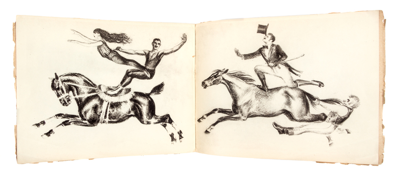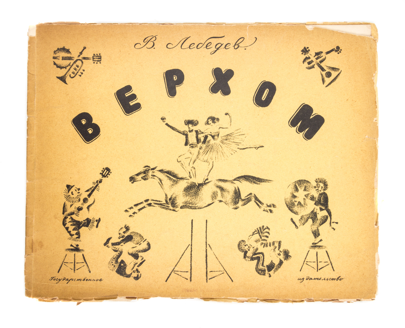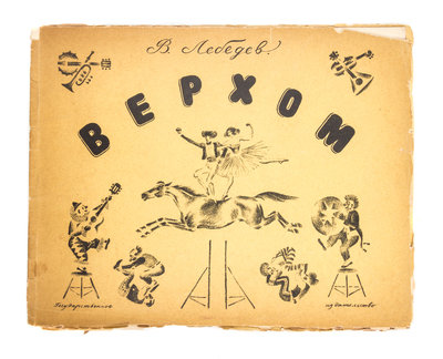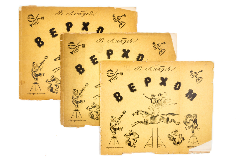 Verkhom [On Horseback]. [St. Petersburg:] GIZ, 1928.Oblong 4to, original decorative wrappers. First and only edition of this series of black and white lithographs of equestrian circus acts. With two other copies of the same; each with significant chipping and wear to wraps.