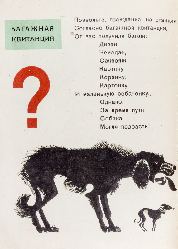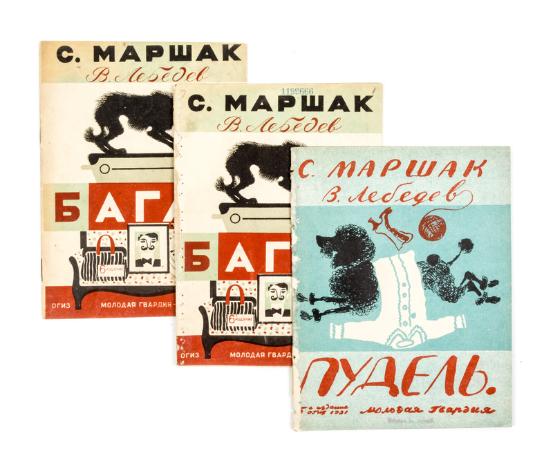 Two works by Samuil Marshak illustrated by Vladimir Lebedev, comprisingBagazh [Baggages] and Pudel [Poodle]. OGIZ [Leningrad]: Molodaia gvardiia, 1931. 2 vols. 8vo, contents stapled in color lithograph wrappers.