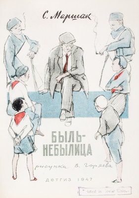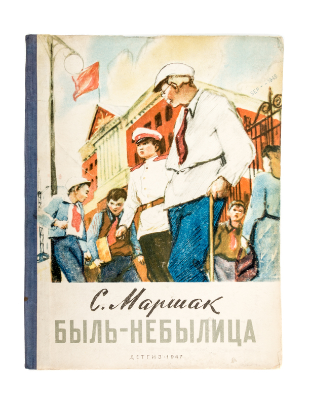 Byl-nebylitsa [A True Story - A Fable]. Moscow: Detgiz, 1947.4to, original printed boards, cloth-backed, date ("Sep -- 1948") stamped to upper board and endpaper, "Printed in Soviet Union" stamped to title page. Marshak juxtaposes the privileged classes of the old regime with the hard lives of working people in this collection of poetry. Boards soiled; some brown staining from stapled interior.