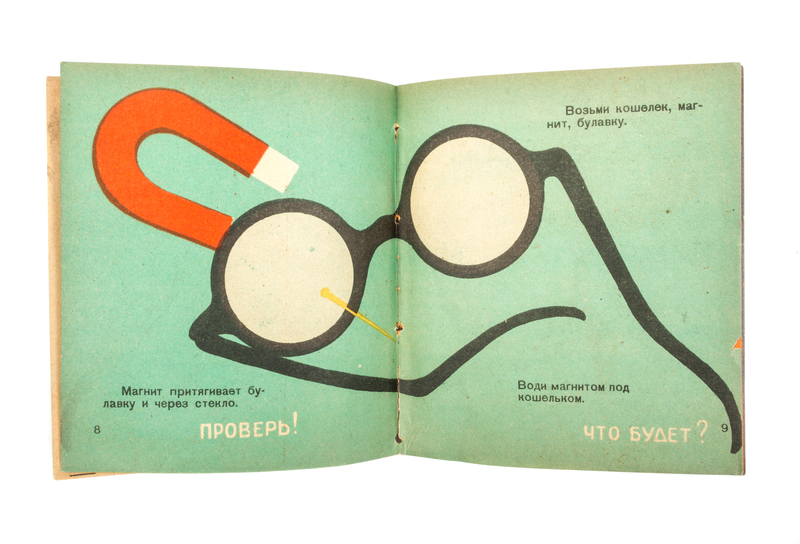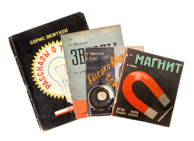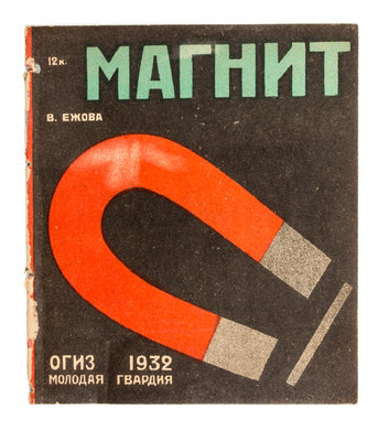 Magnit [The Magnet]. Moscow: Molodaia gvardiia, 1932. 12mo, original lithograph wrap (unsewn). [Together with:] three other works pertaining to science: Rasskazy o tekhnike: pro etu knigu svet bez ogniatelegramma [Stories about the Technique: Light without Fire, the Telegram], by Boris Zhitkov. Illustrated by M. Tsekhanovskogo. Moscow: GIZ, 1942; Zvezdy [The Stars]. Illustrated by D. Mel'nikova. Moscow: Molodaia Gvardiia, 1932; Vysoko vverkh Gluboko vniz [High Up, Deep Down], by M.O. Gershenzon. Illustrated by A. Brei. Moscow: Molodaia gvardiia, 1932. (4 total).