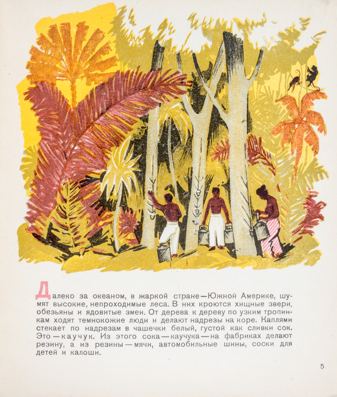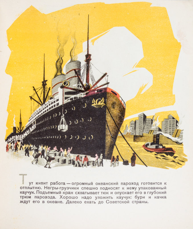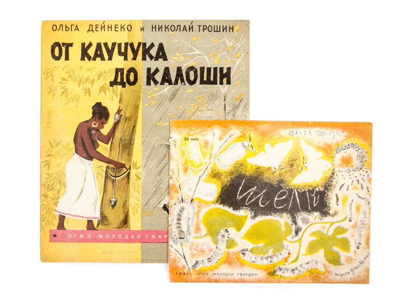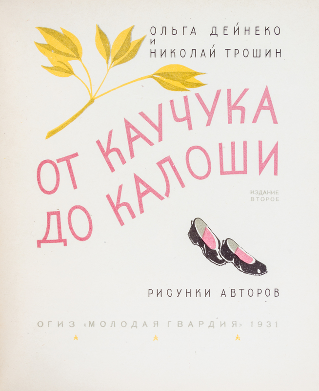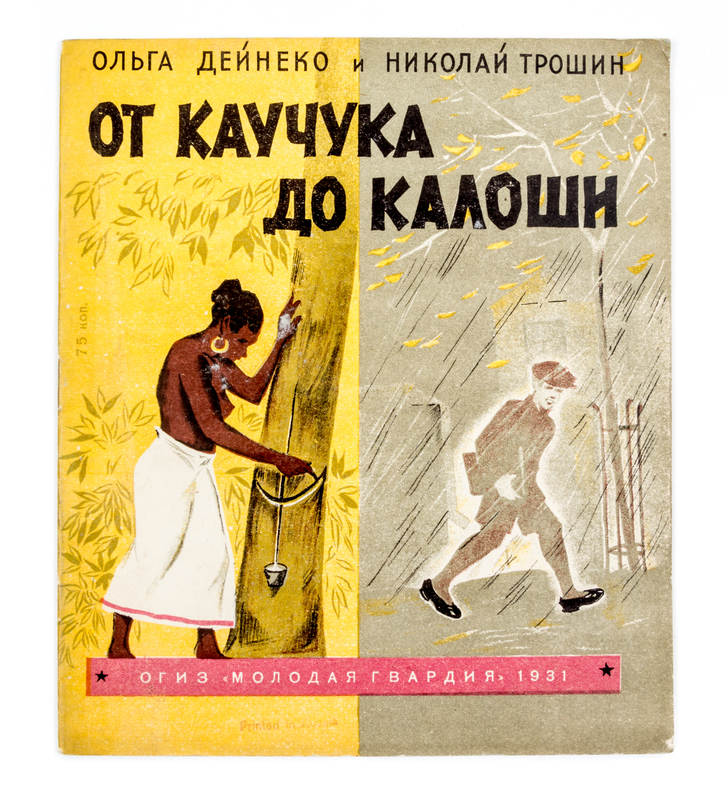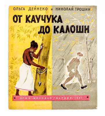 Ot kauchuka do kaloshi [From Rubber to Galoshes]. OGIZ [Moscow]: Molodaia gvardiia, 1931.8vo, contents stapled in lithograph wraps. A production book by Olga Deinneko, showing the raw material, here rubber, gleaned from South America (map on the verso to upper wrap), to finished shoes. [Together with:] Shel [Silk], by Olga Trizna. OGIZ [Leningrad]: Molodaia gvardiia, 1931. From the silk worm to the loom, following the production of silk.
