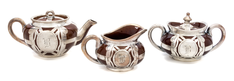 A Ceramic Silver Overlay Dimunitive Tea Service