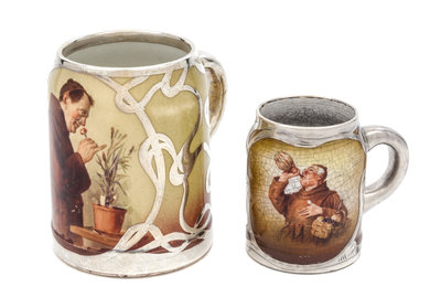each of tapering handled form, both decorated with a monk, having Art Nouveau scrolling silver overlays.