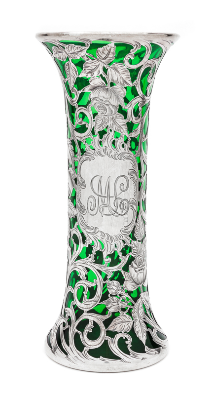 the emerald body having floral and foliate scroll overlay, stamped for Alvin.