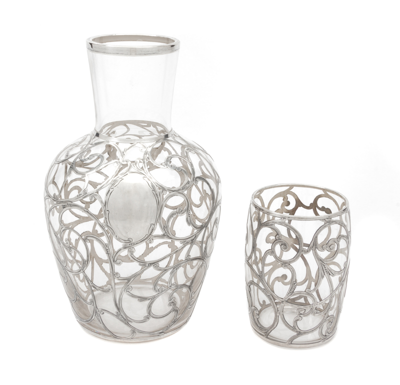 the bottle and cup each with foliate scroll overlay, the bottle with vacant cartouche, stamped STERLING.
