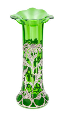 of tapering, ribbed form with ruffled rim, the floral overlay stamped for La Pierre.
