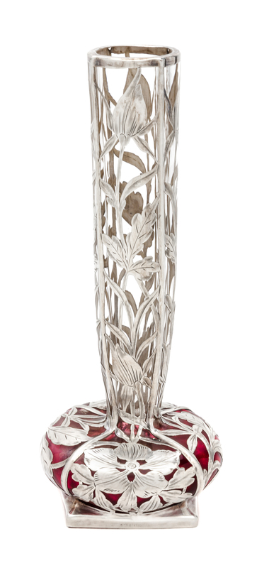 of elongated bottle form with square foot, the foliate overlay stamped STERLING.