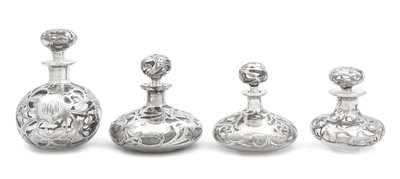 A Group of Four Silver Overlay Glass Scent Bottles