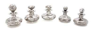 of various form and size, each with foliate scroll overlay and stopper, comprising a near pair marked for La Pierre and three similar bottles marked for Alvin.