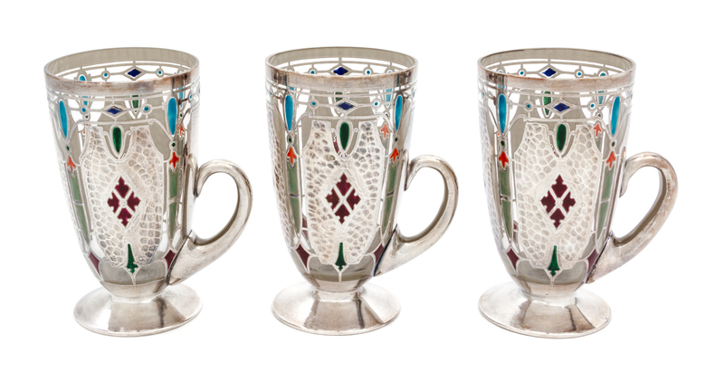 Three Art Nouveau Enameled and Silver Overlay Glass Mugs