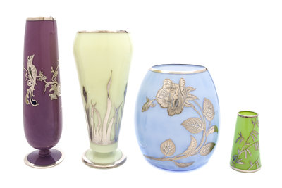 comprising one of tapering form with overlay depicting a phoenix perched on flowering branches and raised on a circular foot, one of tapering form having floral overlay and numbered 15-50-11 to the underside, one of ovoid form having floral overlay and stamped STERLING, and one of tapering form having foliate overlay.
