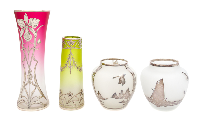 Four Silver Overlay Satin Glass Vases