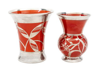 comprising a Thomas Bavaria example of tapering form with a flared mouth having foliate overlay stamped 1000 / 100 with a rubbed hallmark, together with an Edelstein Bavaria example of baluster form having floral and linear overlay stamped 1000 with a rubbed hallmark.