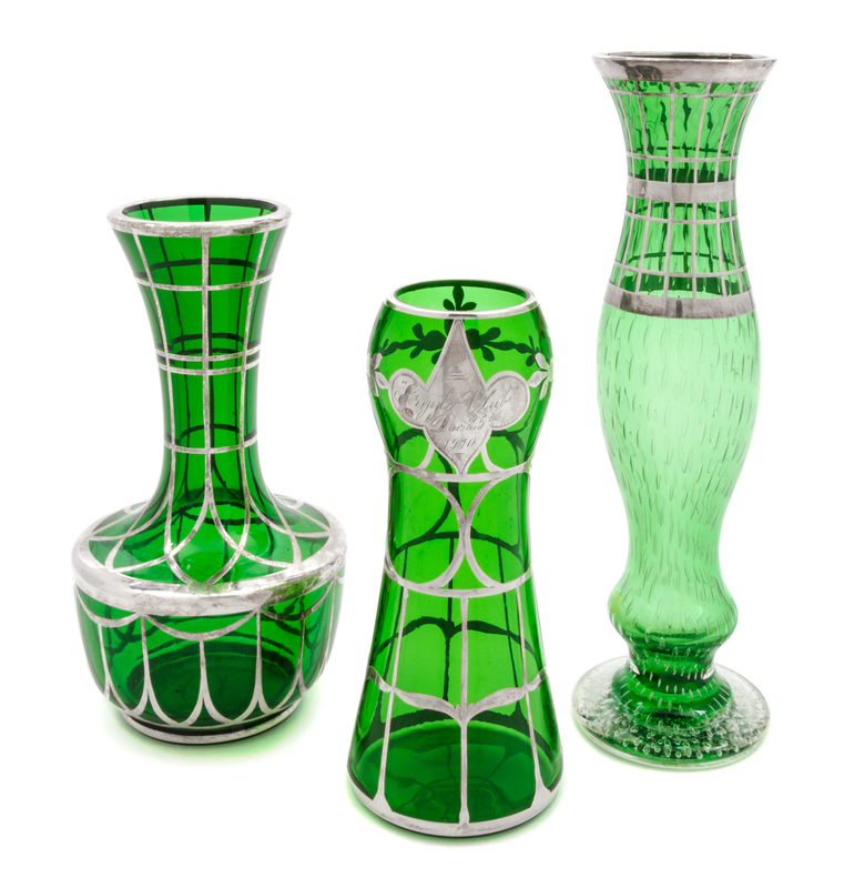 comprising one of baluster form having linear overlay, one of bottle form having curvilinear overlay stamped STERLING, and one of tapering form having floral and linear overlay with a cartouche inscribed Argyle Club / Dec. 25th / 1910, stamped STERLING.