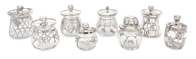 A Collection of Eight Silver Overlay Covered Jars