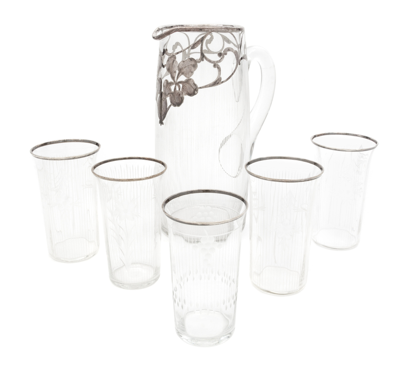 comprising a pitcher having floral overlay with a monogrammed oval cartouche above vertical wheel cut striations, stamped STERLING, together with five glasses having floral, foliate and linear wheel cut decoration and overlay rims.