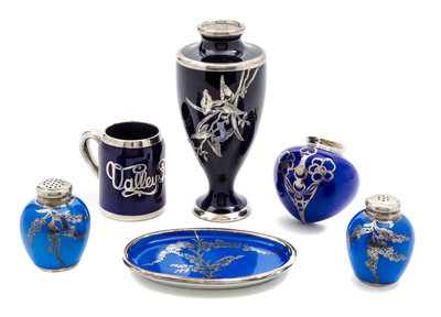 comprising a baluster form vase, a demitasse mug, a diminutive wall pocket, and salt and pepper shakers with an associated underplate,