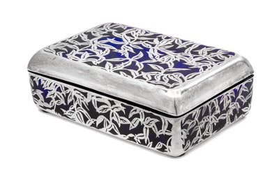 of rectangular form, the cover opening to a segemented interior, the cobalt glass body having foliate overlay, apparently unmarked.
