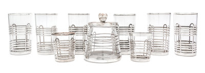 comprising eight cups and a covered jar, each with linear and curvilinear overay, the cups stamped STERLING D108, the covered jar stamped STERLING D343.