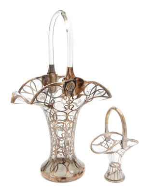 each of typical form, the larger example having a ruffled rim and foliate scroll overlay, stamped 999/1000 FINE, the smaller example having linear and swag overlay, marked for La Pierre.
