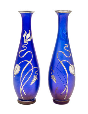 A Pair of Silver Overlay Iridescent Glass Vases