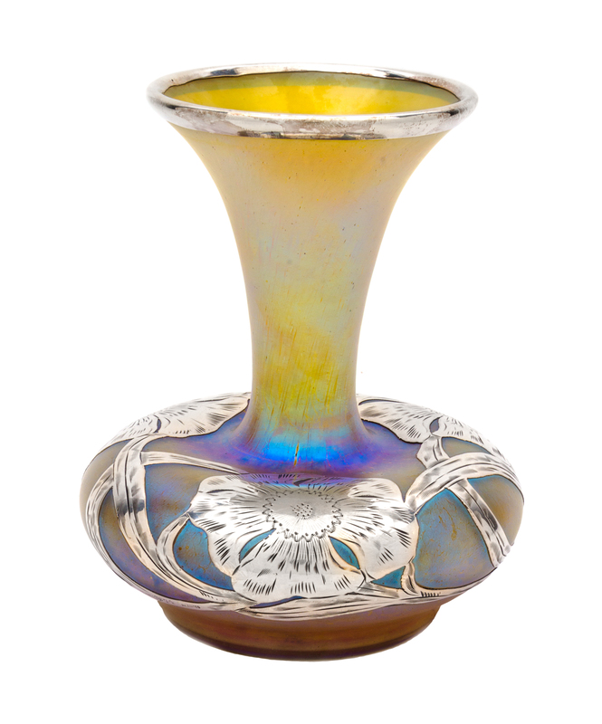 of bottle form with a flared mouth, having floral overlay marked for Alvin, numbered 66 to the underside.