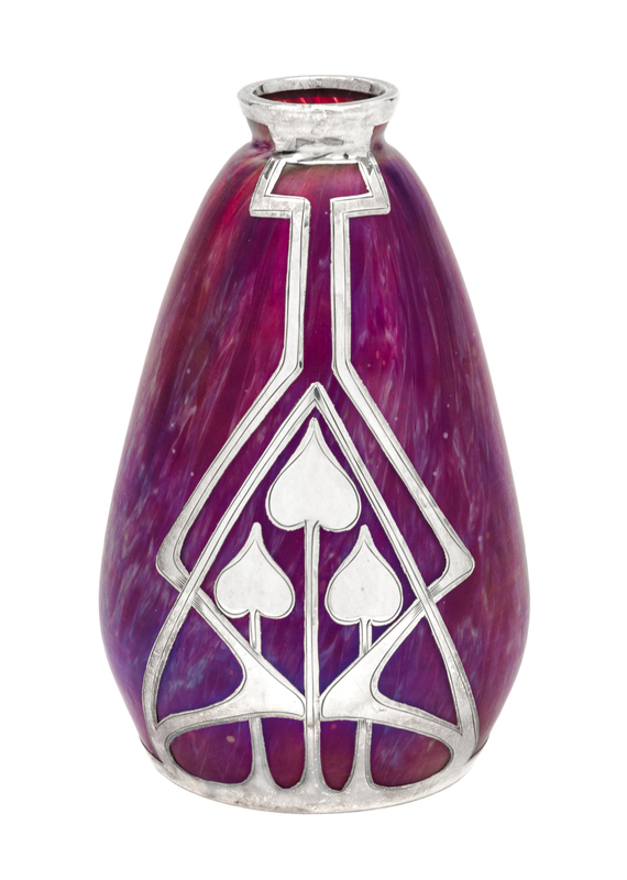 of tapering form in striated purple glass, the linear overlay enclosing three spades stamped STERLING.