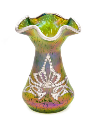 of tapering form with a flared, ruffled rim, having oilspot decoration, with scrolling Art Nouveau overlay.