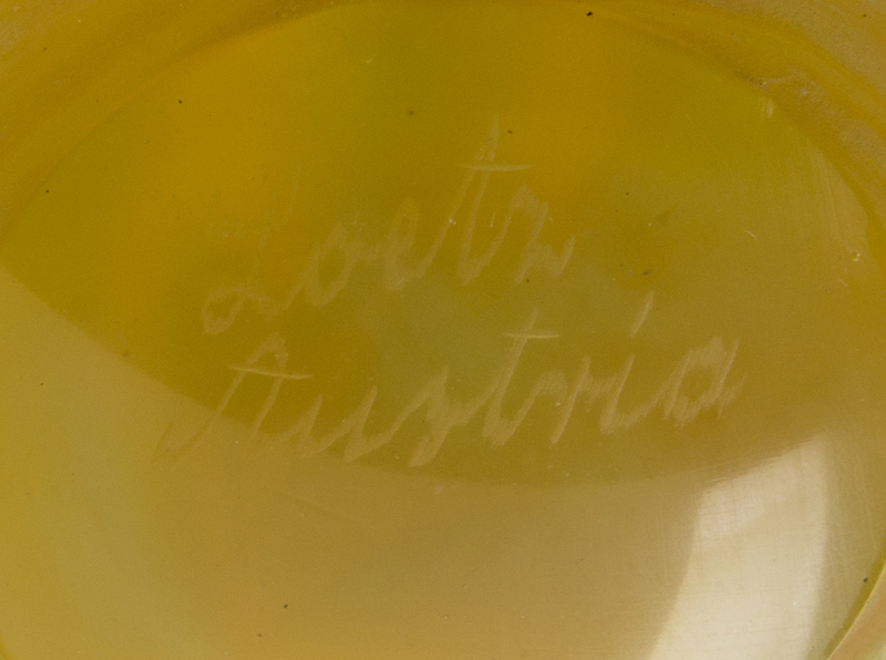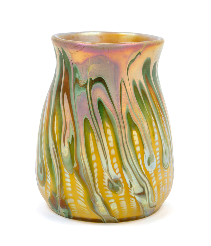 of tapering irregular form with a flared mouth, having drip decoration over the internally decorated body, with etched Loetz Austria signature.
