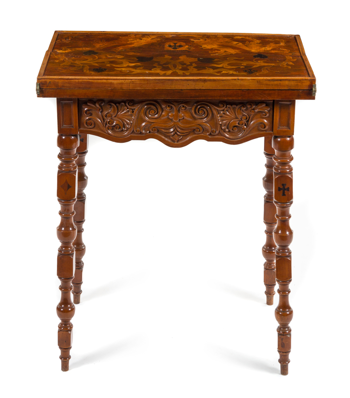 the hinged, foliate and griffon decorated top opening to a bird's eye maple gaming surface flanked by figural panels depicting a figure from eash suit of cards, raised on a similarly worked Renaissance Revival base, the top signed Emile Galle Nancy.