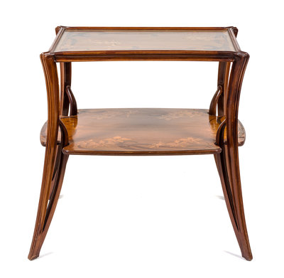 the rectangular, foliate decorated top raised on channel molded, splayed legs joined by a similarly decorated, shaped medial shelf, the top signed L Majorelle.