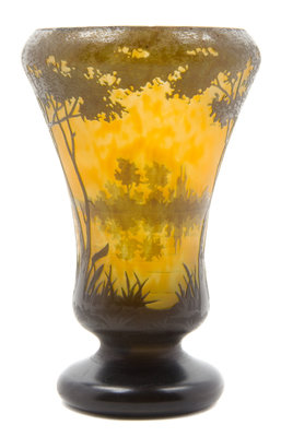 of baluster form decorated with a continuous forested lake landscape scene, signed Daum Nancy in cameo with the Cross of Lorraine.