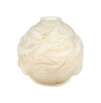 of spherical, form with raised fish designs and an etched signature to the underside.