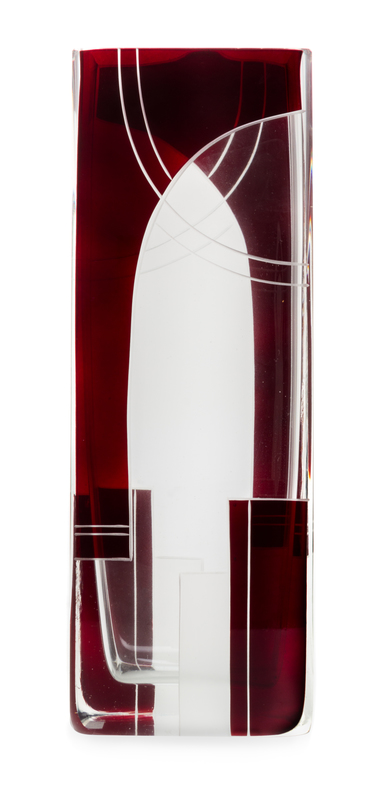 of rectangular form in clear glass with black enamel geometric overlays and conforming linear decoration.