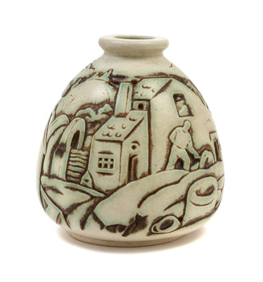 the case incised to depict a village scene.