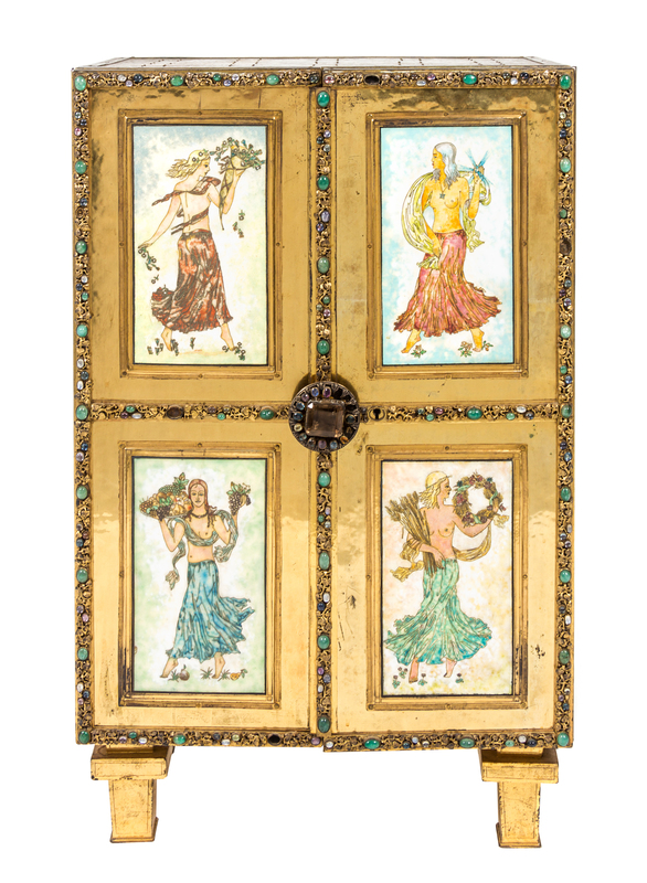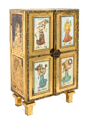 of rectangular form, the two hinged doors each set with two plaques depicting maidens representing the seasons.