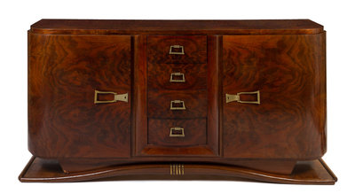 of rectangular form with rounded corners, having four drawers flanked by two doors.
