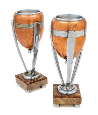 A Pair of Art Deco Silvered Metal and Copper Urns
